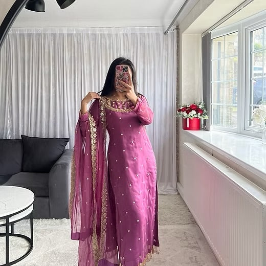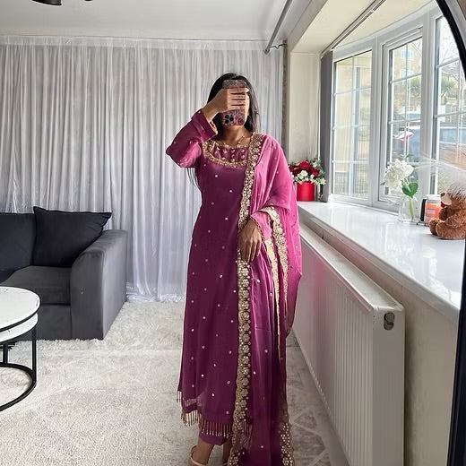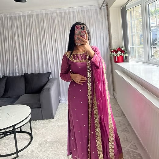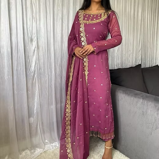 A stunning chiffon ensemble designed for elegant occasions. The kameez features delicate mirror work throughout with detailed embellishment along the neckline and front for a soft festive sparkle.
