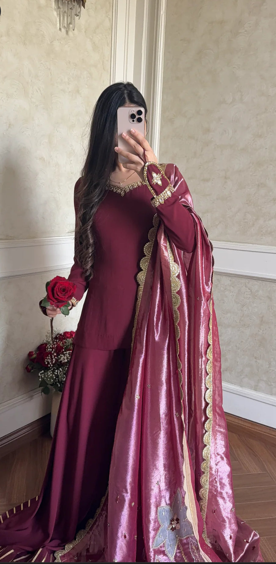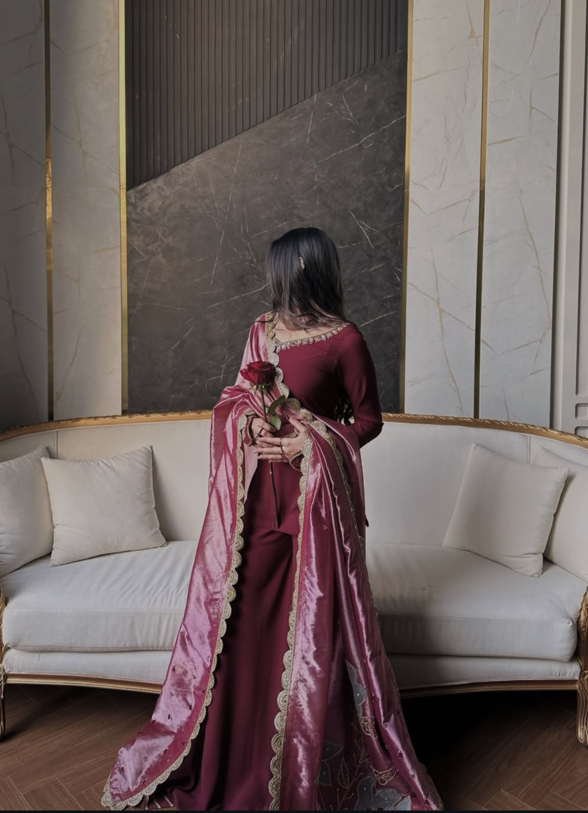 This elegant formal dress is crafted from opulent georgette, featuring a rich wine-toned base that flows gracefully into a floor-length silhouette. The outfit is designed with a wide scoop neckline highlighted by delicate gold embellishment, adding a refined touch of luxury. Full-length fitted sleeves enhance its sleek structure, while the contrasting rose-pink Tissue dupatta elevates the look with its scalloped gold lace edging and subtle embroidered accents. The overall design balances minimal detailing with regal sophistication, making it a timeless choice for formal evenings and festive occasions.