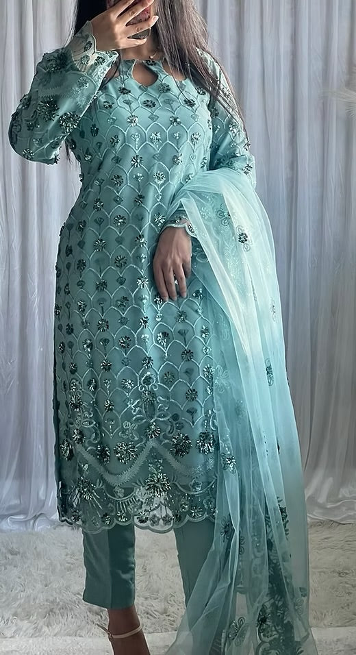 A stunning chiffon ensemble featuring heavy embroidery and sequin work on both the front and back for full glamour. Paired with a delicate net dupatta and tailored capri pants.